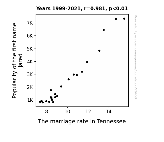 This means 96.3% of the change in the one variable (i.e., The marriage rate in Tennessee) is predictable based on the change in the other (i.e., Popularity of the first name Jared) over the 23 years from 1999 through 2021.