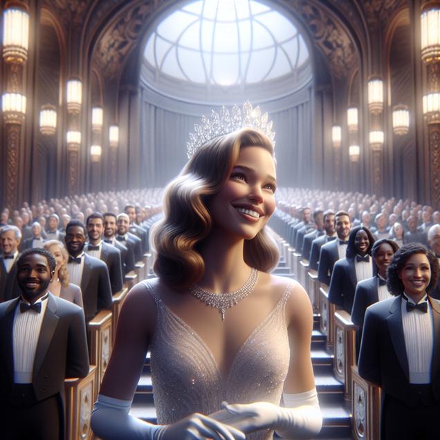 ChatGPT: A sparkly crown is placed on the head of a woman in her 20s, who is smiling and waving to the crowd. Surrounding her are 100 ushers, each dressed in formal attire, standing in a beautiful California theater.