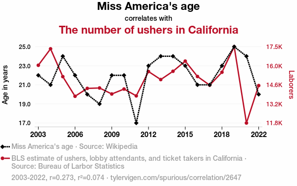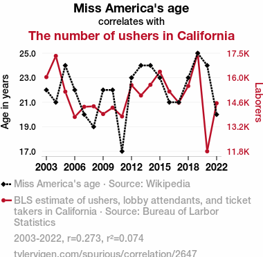 A linear line chart with years as the X-axis and two variables on the Y-axis. The first variable is Miss America's age and the second variable is The number of ushers in California.  The chart goes from 2003 to 2022, and the two variables track closely in value over that time. Small Image