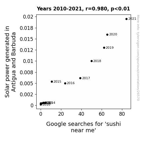 This means 96% of the change in the one variable (i.e., Google searches for 'sushi near me') is predictable based on the change in the other (i.e., Solar power generated in Antigua and Barbuda) over the 12 years from 2010 through 2021.