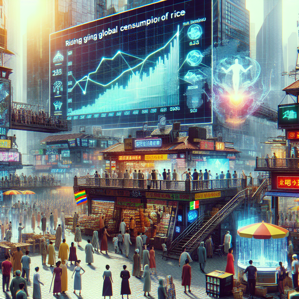 User prompt: Please describe a visual scene that prominently depicts both Global Rice Consumption and Brookfield's stock price (BN), in the following situation: As global rice consumption rose, so did Brookfield's stock price. Investors realized that while rice may fill people's bellies, Brookfield's projects fill their pockets. The market saw the company as essential to the world's grain consumption, driving up its stock price.. Keep the description simple.