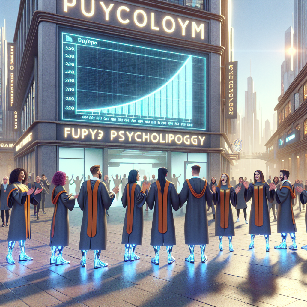 User prompt: Please respond with an image generation prompt that would be likely to create an interesting visual using DALLE-3, using the following style: [ Futuristic ] and depicting this scene: In a bustling university town, a group of graduates proudly hold their Master's degrees in Psychology, celebrating their hard-earned achievements. Nearby, a Lululemon store displays a prominent sign showing the soaring stock price (LULU) as the demand for their yoga pants skyrockets. The store is seeing an influx of psychologists purchasing yoga pants as a coping mechanism for their stressed-out clients, causing the stock price to surge. Keep the visual depiction simple. Do not include any words or speech bubbles.