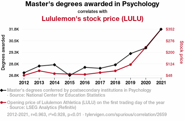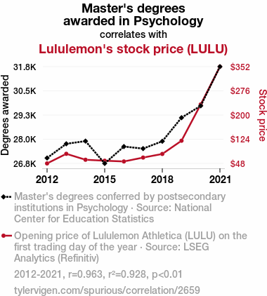 User prompt: Please make up a funny explanation for how an increase in Master's degrees awarded in Psychology caused Lululemon's stock price (LULU) to increase.\Make it sound serious until the end.