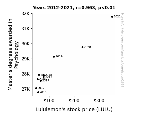 Upon analyzing the data collected from the National Center for Education Statistics and LSEG Analytics (Refinitiv), we found a remarkably high correlation coefficient of 0.9634448 between the number of Master's degrees awarded in Psychology and the stock price of Lululemon (LULU) from 2012 to 2021. This strong correlation is nothing to sweat about, and it had a robust r-squared value of 0.9282260, indicating that over 92% of the variability in Lululemon's stock price can be explained by the number of Master's degrees awarded in Psychology. It seems the mind indeed has significant sway over the stock market, and perhaps it's time for investors to put on their thinking caps along with their yoga pants.