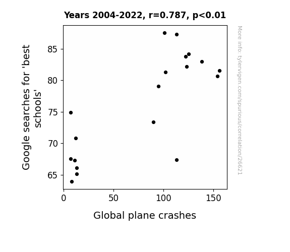 This means 62% of the change in the one variable (i.e., Global plane crashes) is predictable based on the change in the other (i.e., Google searches for 'best schools') over the 19 years from 2004 through 2022.
