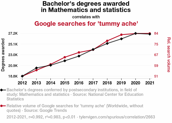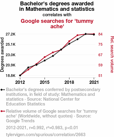 - The spurious research paper: Crunching the Numbers: The Correlation Between Bachelor's Degrees in Mathematics and Statistics and Google Searches for 'Tummy Ache'