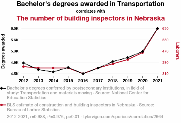 - The spurious research paper: Build a Bridge and Get over It: The Surprising Link between Bachelor's Degrees in Transportation and Materials Moving and the Number of Building Inspectors in Nebraska