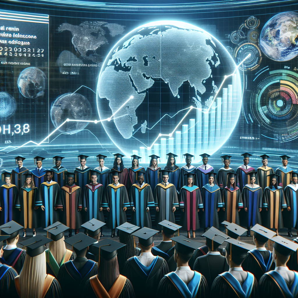 Prompt: Generate an image with a futuristic aesthetic where a university commencement ceremony is taking place. At the forefront, students in academic regalia are receiving their Associate's degrees in engineering technologies. The backdrop features a holographic projection of a graph displaying a sharp downward trend in global kerosene usage, symbolizing the diminishing reliance on kerosene due to the lack of innovation from engineers. The atmosphere exudes a sense of technological advancement and the potential for positive change in the world. The depiction should include only scenes, people, and objects, it should not include text or speech bubbles.