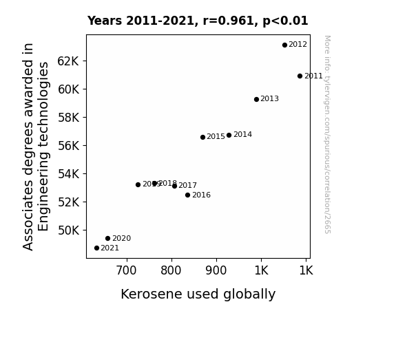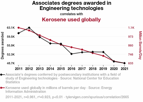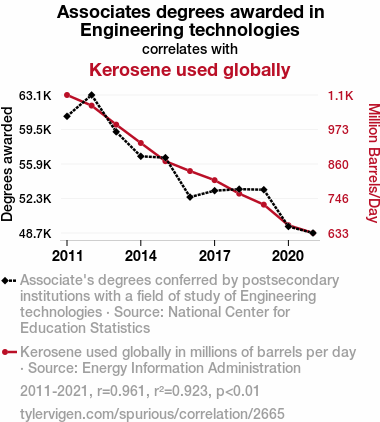 - The spurious research paper: From Degrees to Fuel: Exploring the Correlation Between Engineering Technology Associate Degrees and Global Kerosene Consumption