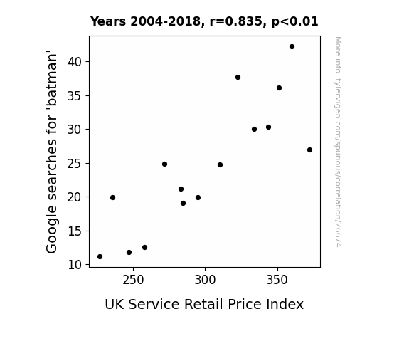 This means 69.7% of the change in the one variable (i.e., UK Service Retail Price Index) is predictable based on the change in the other (i.e., Google searches for 'batman') over the 15 years from 2004 through 2018.