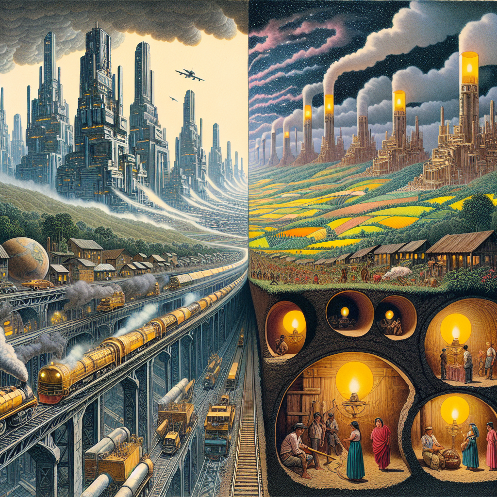 ChatGPT: Generate an image of a sprawling, futuristic cityscape in Ithaca, enveloped in a thick layer of polluted air. The towering buildings are obscured by smog, and cars and factories release billows of toxic fumes into the atmosphere. Meanwhile, depict the tranquil Peruvian countryside, with families using kerosene lamps to light their homes, creating a warm and inviting glow. Show an intricate tunnel system running underground, connecting the two locations and illustrating the secret smuggling of kerosene. Let the image convey the contrasting atmospheres of pollution and tranquility, while hinting at the underground network that connects them.