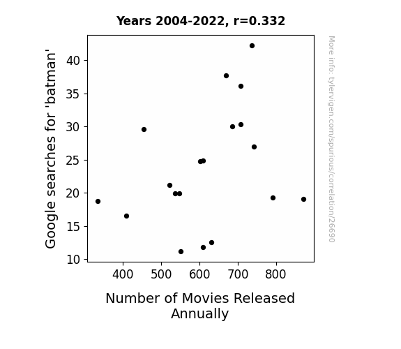 This means 11% of the change in the one variable (i.e., Number of Movies Released Annually) is predictable based on the change in the other (i.e., Google searches for 'batman') over the 19 years from 2004 through 2022.