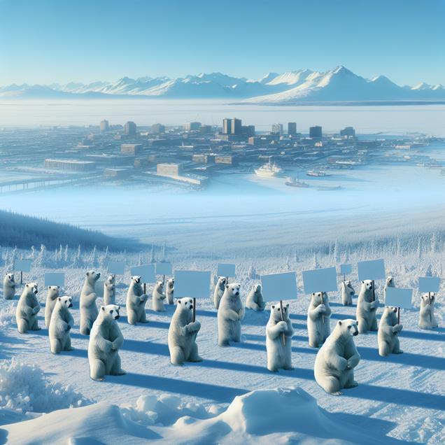 ChatGPT: Generate an image of a serene, snowy landscape in Anchorage, Alaska, with a crystal-clear blue sky. In the distance, the city's skyline is visible, with clean air and minimal pollution. On the snowy mountain peaks, a group of determined polar bears gather, holding protest signs and exuding an air of purpose and unity. Their presence sends a powerful message against excessive kerosene usage, sparking change and drawing attention to environmental concerns.
