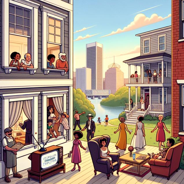 Prompt: An image that looks like it is a scene from a Disney movie where the skies over Richmond, Virginia are depicted clearing up from reduced air pollution. The residents are seen opening their windows and taking leisurely strolls outdoors, engaging in more meaningful activities. The deserted living rooms reflect the plummeting viewership count for the soap opera "Days of Our Lives." The depiction should include only scenes, people, and objects, it should not include text or speech bubbles.