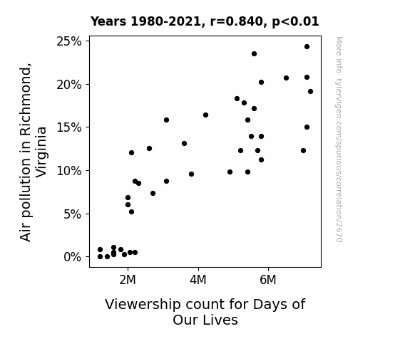 This means 70.6% of the change in the one variable (i.e., Viewership count for Days of Our Lives) is predictable based on the change in the other (i.e., Air pollution in Richmond, Virginia) over the 42 years from 1980 through 2021.