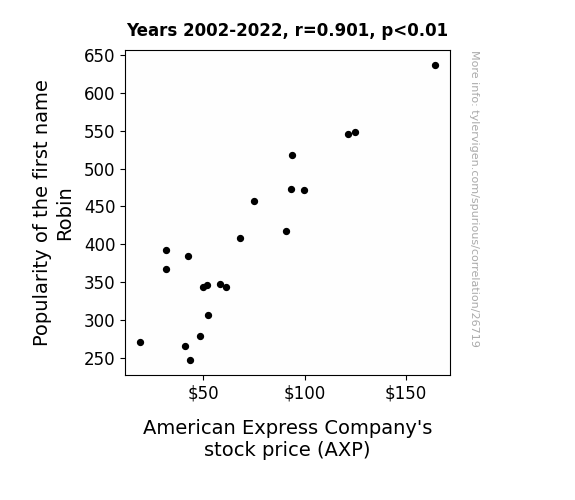 This means 81.2% of the change in the one variable (i.e., American Express Company's stock price (AXP)) is predictable based on the change in the other (i.e., Popularity of the first name Robin) over the 21 years from 2002 through 2022.