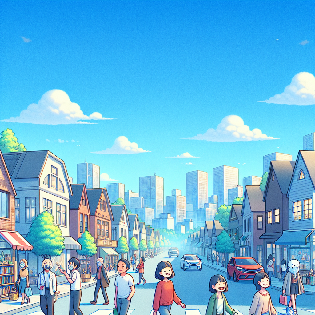 ChatGPT: Generate an image of a vibrant, picturesque small town, with clear blue skies, lush green trees, and happy residents appreciating the clean air. The town's skyline should be prominently visible, free from the smog that once shrouded it. People can be seen walking along clean streets, smiling and enjoying the newfound purity of the environment. The local bookstore should be depicted with a decrease in demand for philosophical books, contrasting the lively atmosphere outside. This image should convey a sense of tranquility and contentment, capturing the positive impact of improved air quality on the town's residents.