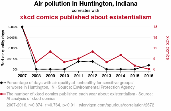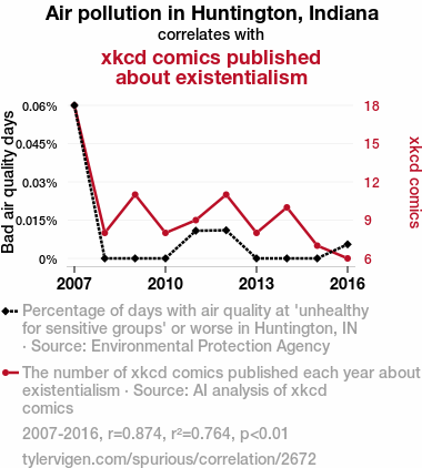 A linear line chart with years as the X-axis and two variables on the Y-axis. The first variable is Air pollution in Huntington, Indiana and the second variable is xkcd comics published about existentialism.  The chart goes from 2007 to 2016, and the two variables track closely in value over that time. Small Image