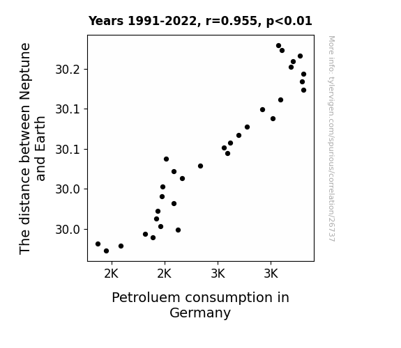 This means 91.2% of the change in the one variable (i.e., Petroluem consumption in Germany) is predictable based on the change in the other (i.e., The distance between Neptune and Earth) over the 32 years from 1991 through 2022.