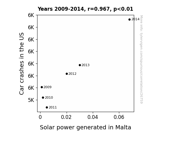 This means 93.5% of the change in the one variable (i.e., Solar power generated in Malta) is predictable based on the change in the other (i.e., Car crashes in the US) over the 6 years from 2009 through 2014.