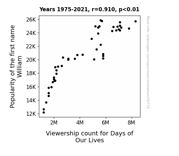 This means 82.8% of the change in the one variable (i.e., Viewership count for Days of Our Lives) is predictable based on the change in the other (i.e., Popularity of the first name William) over the 47 years from 1975 through 2021.