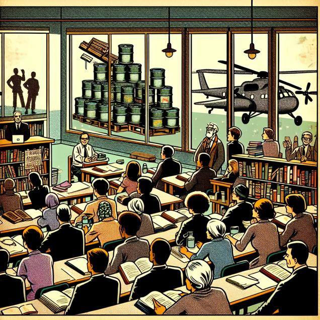 Prompt: Generate a comic-book-style illustration with muted colors and a dotted halftone pattern from the 1960s that depicts a classroom in Louisiana. Inside, a group of social work teachers, their numbers visibly increased, gather surrounded by books and resources, exuding empathy and warmth. Outside the window, a shipment of kerosene barrels is being loaded onto a plane, destined for Iraq, symbolizing the surplus generated by this increase in empathy. The depiction should include only scenes, people, and objects, it should not include text or speech bubbles.