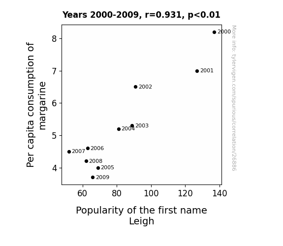 This means 86.7% of the change in the one variable (i.e., Popularity of the first name Leigh) is predictable based on the change in the other (i.e., Per capita consumption of margarine) over the 10 years from 2000 through 2009.
