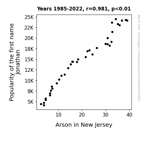 This means 96.3% of the change in the one variable (i.e., Arson in New Jersey) is predictable based on the change in the other (i.e., Popularity of the first name Jonathan) over the 38 years from 1985 through 2022.