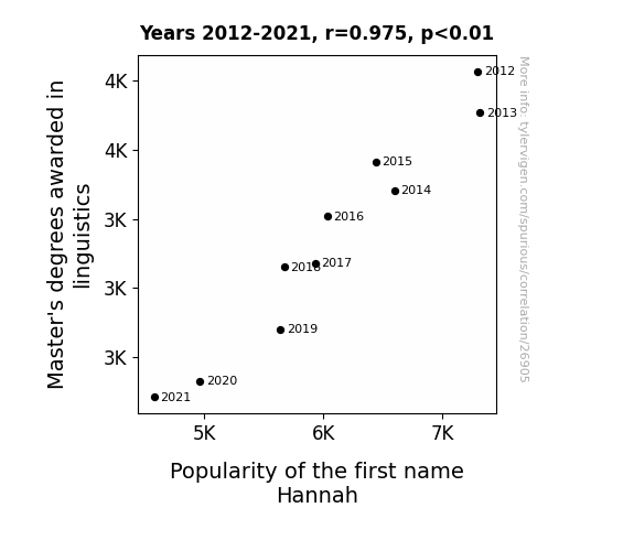 This means 95% of the change in the one variable (i.e., Popularity of the first name Hannah) is predictable based on the change in the other (i.e., Master's degrees awarded in linguistics) over the 10 years from 2012 through 2021.
