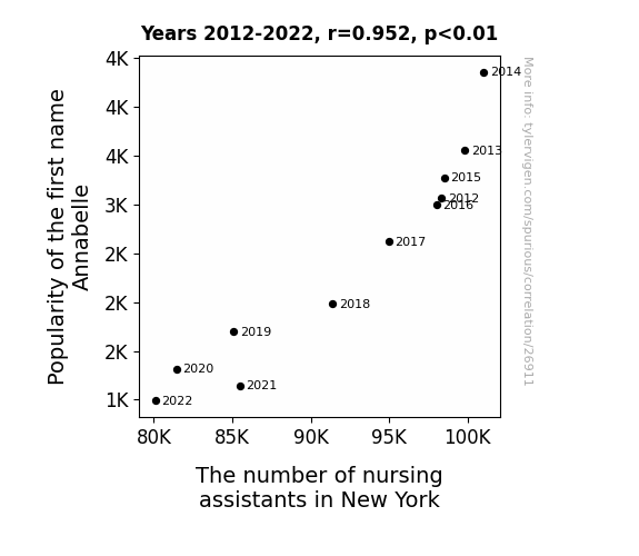 This means 90.7% of the change in the one variable (i.e., The number of nursing assistants in New York) is predictable based on the change in the other (i.e., Popularity of the first name Annabelle) over the 11 years from 2012 through 2022.