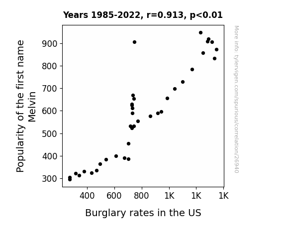 This means 83.4% of the change in the one variable (i.e., Burglary rates in the US) is predictable based on the change in the other (i.e., Popularity of the first name Melvin) over the 38 years from 1985 through 2022.