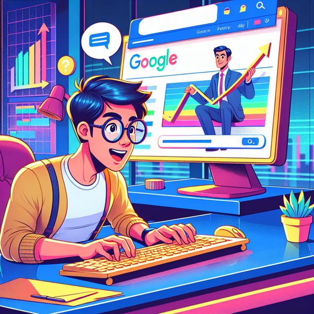 Prompt: Prompt: Generate a cute 2D animation of a person sitting at their colorful computer desk. The person has a large pair of glasses and is busy typing on the keyboard with excitement. The computer screen shows a vibrant "Google" search page with "where can I stream Friends" typed into the search bar. A playful animated version of the "Google" logo hovers above the search bar. Next to the search results, there is a stock market graph displaying Lululemon's stock price trending upward. The person looks curious and engaged as they interact with the animated interface. The depiction should include only scenes, people, and objects, it should not include text or speech bubbles.