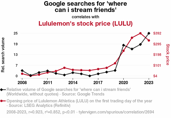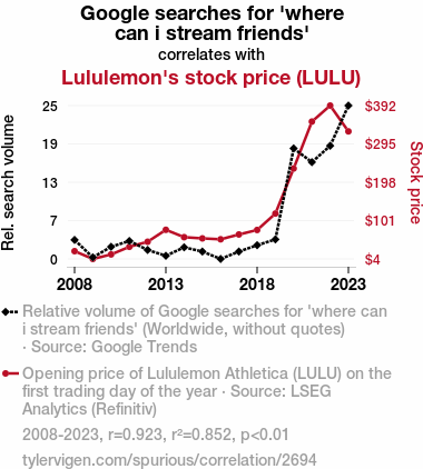 - The spurious research paper: A Streamy Affair: Unveiling the Correlation Between 'Where Can I Stream Friends' Google Searches and Lululemon's Stock Price