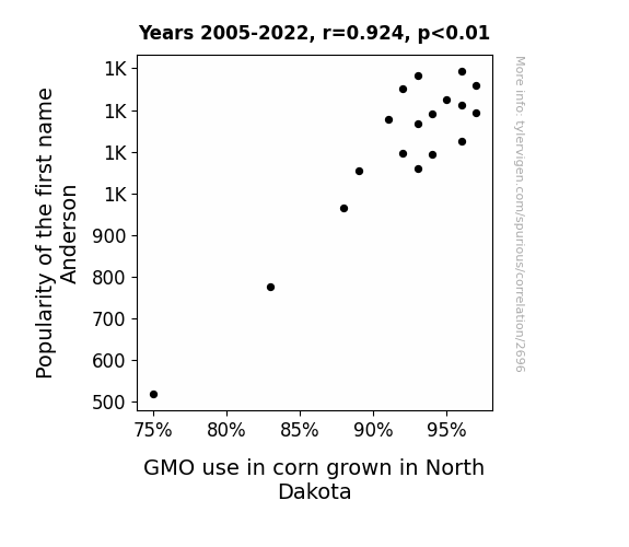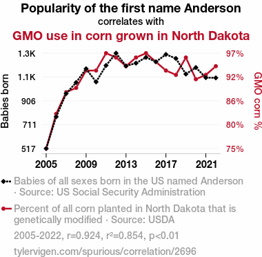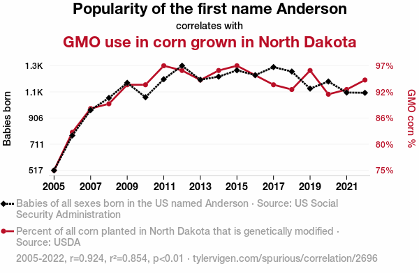 Anderson, given names, GMO, corn production, North Dakota, correlation, United States Department of Agriculture, US Social Security Administration, data analysis, correlation coefficient, GMO technology, genetically modified organisms, nomenclature, agriculture, interconnectedness, research, narrative