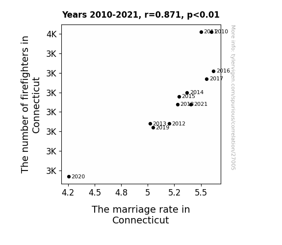This means 75.9% of the change in the one variable (i.e., The marriage rate in Connecticut) is predictable based on the change in the other (i.e., The number of firefighters in Connecticut) over the 12 years from 2010 through 2021.