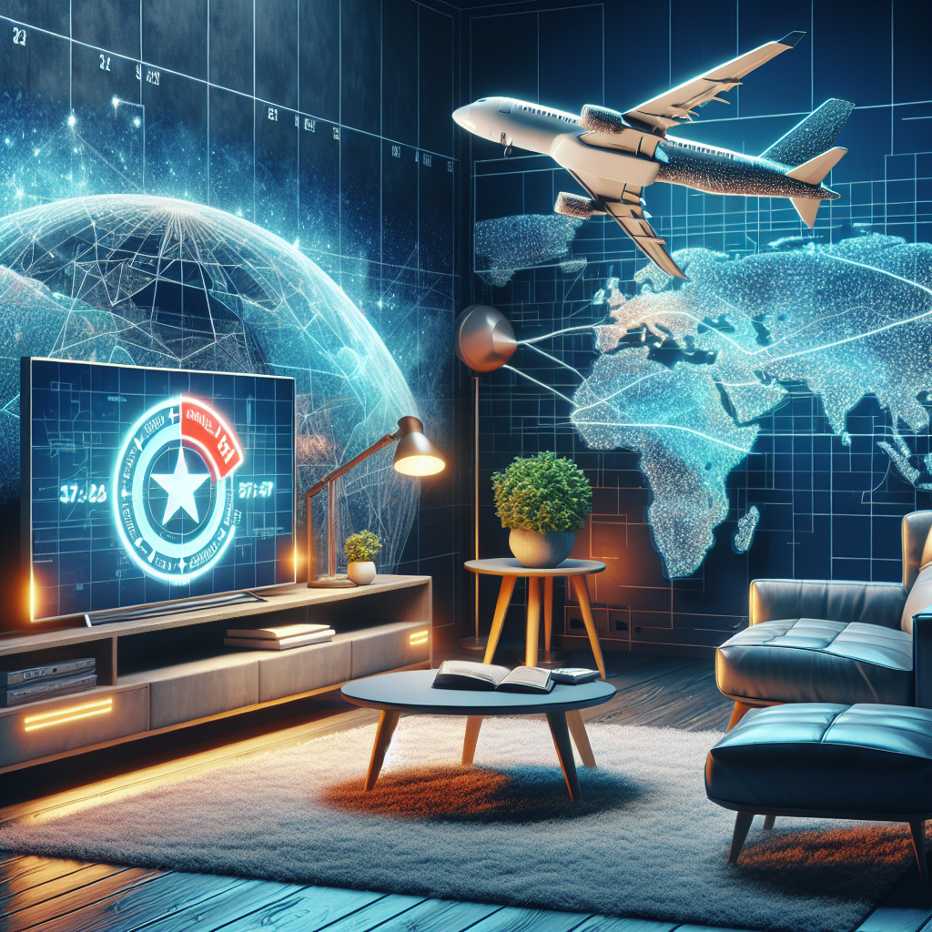 User prompt: Please respond with an image generation prompt that would be likely to create an interesting visual using DALLE-3, using the following style: [ Futuristic ] and depicting this scene: In a cozy living room, a TV displays the Season rating of "Two and a Half Men" while a map of Serbia is on the wall behind it. In the corner, a small model plane represents the jet fuel used in Serbia, creating a unique blend of entertainment and travel. Keep the visual depiction simple. Do not include any words or speech bubbles.