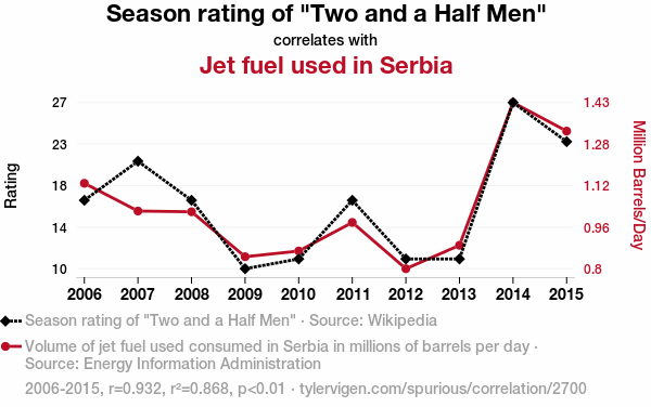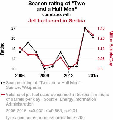 - The spurious research paper: Fueling Laughter: Exploring the Comedic Connection Between 'Two and a Half Men' Season Ratings and Jet Fuel Consumption in Serbia