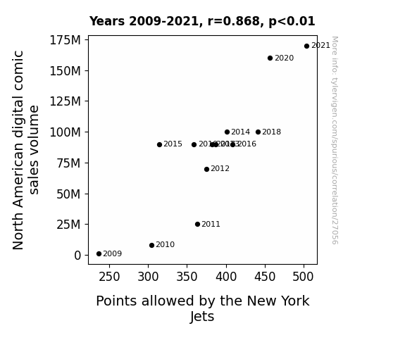This means 75.4% of the change in the one variable (i.e., Points allowed by the New York Jets) is predictable based on the change in the other (i.e., North American digital comic sales volume) over the 13 years from 2009 through 2021.