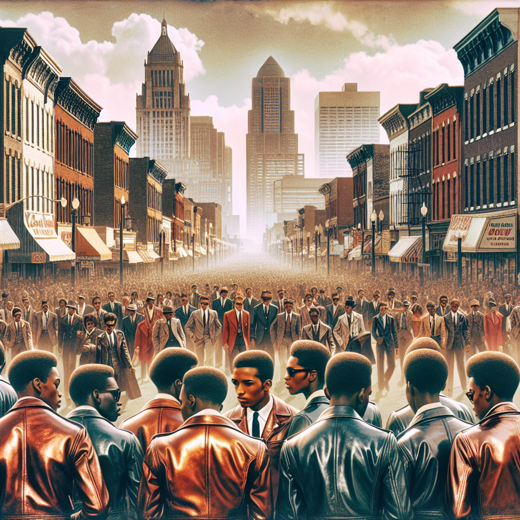 Prompt: Generate an image of a busy street in Central City, Kentucky, crowded with people wearing shiny leather jackets. Show the distinct fashion trend and a hazy skyline in the background due to increased air pollution, which symbolizes the rise in popularity of the name Alfonso. Capture the essence of the era with a vintage aesthetic, displaying the bustling activity and the impact of the trend on the environment. The depiction should include only scenes, people, and objects, it should not include text or speech bubbles.