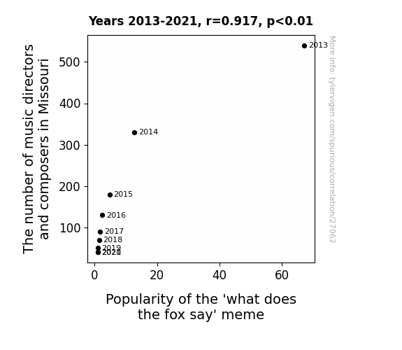 This means 84% of the change in the one variable (i.e., Popularity of the 'what does the fox say' meme) is predictable based on the change in the other (i.e., The number of music directors and composers in Missouri) over the 9 years from 2013 through 2021.