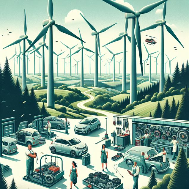 User prompt: Please respond with an image generation prompt that would be likely to create an interesting visual using DALLE-3, using the following style: [ A Discovery magazine cover image ] and depicting this scene: Wind power generated in Luxembourg led to a surge in wind turbines across the landscape, with the blades spinning vigorously. As the wind picked up, it carried airborne debris such as leaves and small twigs from the forests, and the debris made its way into the supply chain for Volkswagen Group of America. Meanwhile, in the showroom of Volkswagen Group of America, cars were being recalled and mechanics were busy inspecting and repairing various car components. Keep the visual depiction simple. Do not include any words or speech bubbles.