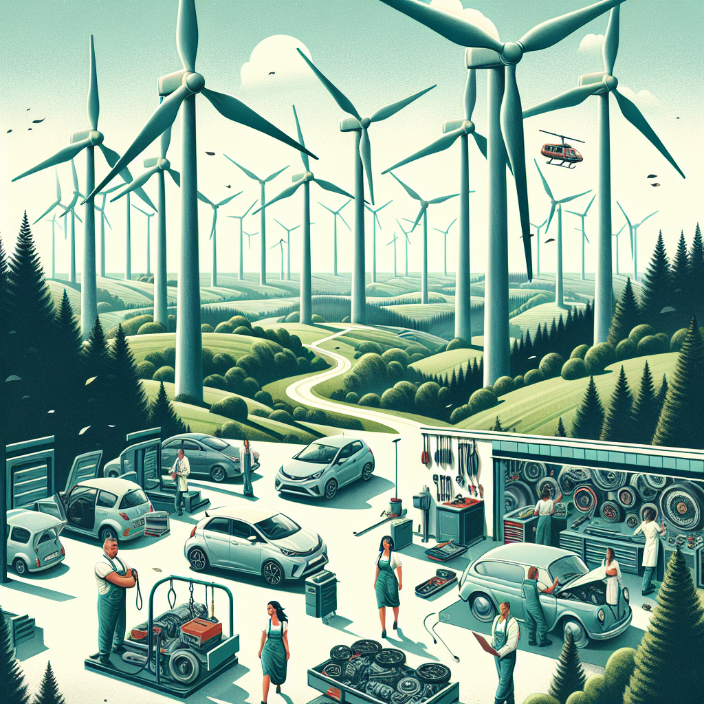 Prompt: Create an image featuring a landscape of Luxembourg showcasing an array of wind turbines with blades spinning vigorously. The turbines are surrounded by forests, with leaves and small twigs being carried through the air by the wind. In the distance, a Volkswagen Group of America showroom can be seen, where mechanics are inspecting and repairing various car components, while cars are being recalled. The depiction should include only scenes, people, and objects, it should not include text or speech bubbles.