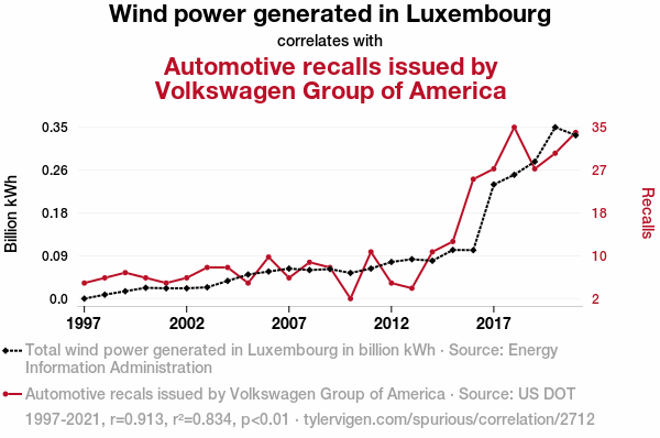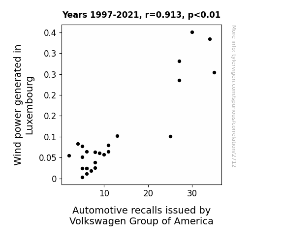This means 83.4% of the change in the one variable (i.e., Automotive recalls issued by Volkswagen Group of America) is predictable based on the change in the other (i.e., Wind power generated in Luxembourg) over the 25 years from 1997 through 2021.