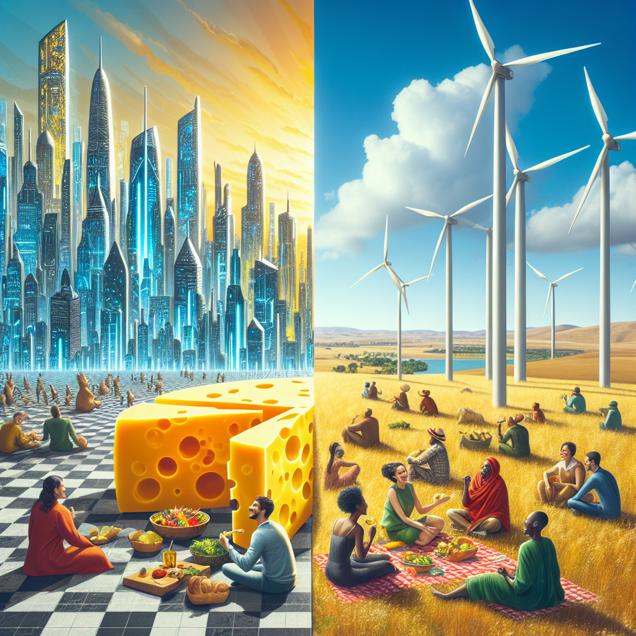 Prompt: Create an image of a juxtaposition between two worlds: in one half, show a sprawling, futuristic American cityscape with joyful citizens sharing slices of American cheese at a picnic amidst towering, translucent skyscrapers. The cheese exudes a golden glow suggesting its vitality. In the other half, visualize the sprawling plains of Burkina Faso adorned with sleek wind turbines spinning vigorously against an azure sky, harnessing the wind energy generated by an unseen source as a symbol of sustainable progress. The depiction should include only scenes, people, and objects, it should not include text or speech bubbles.