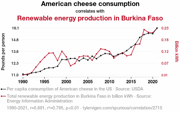 A linear line chart with years as the X-axis and two variables on the Y-axis. The first variable is American cheese consumption and the second variable is Renewable energy production in Burkina Faso.  The chart goes from 1990 to 2021, and the two variables track closely in value over that time. Small Image