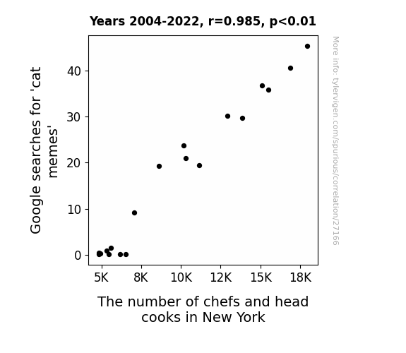 This means 97% of the change in the one variable (i.e., The number of chefs and head cooks in New York) is predictable based on the change in the other (i.e., Google searches for 'cat memes') over the 19 years from 2004 through 2022.