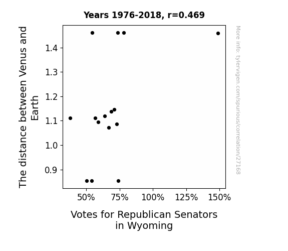 This means 22% of the change in the one variable (i.e., Votes for Republican Senators in Wyoming) is predictable based on the change in the other (i.e., The distance between Venus and Earth) over the 15 years from 1976 through 2018.