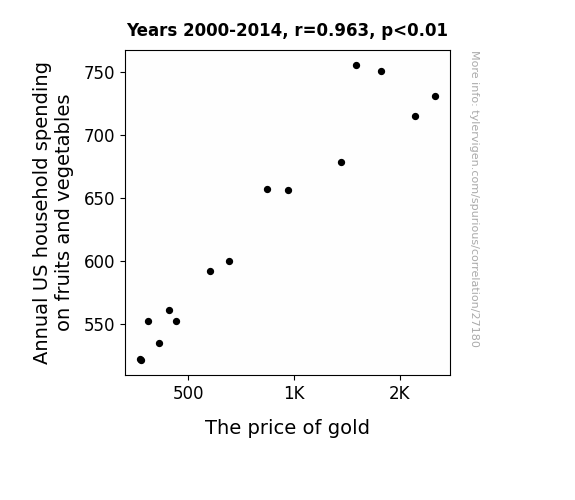 This means 92.7% of the change in the one variable (i.e., The price of gold) is predictable based on the change in the other (i.e., Annual US household spending on fruits and vegetables) over the 15 years from 2000 through 2014.