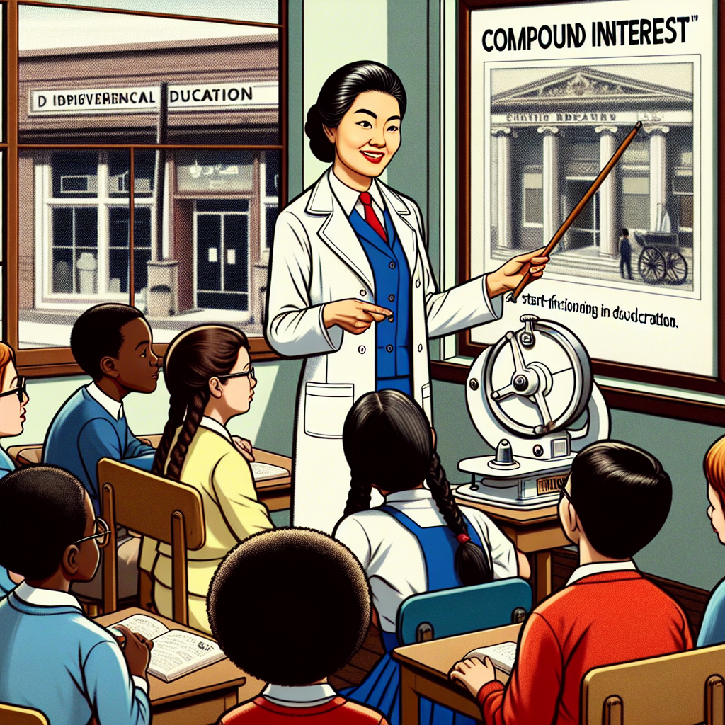 ChatGPT: In a classroom, a teacher proudly holds a Master's degree in Education, surrounded by a small group of students showing keen interest and understanding as she explains compound interest on a whiteboard. Meanwhile, outside the window, a closed bank with a sign reading "Bank Failure" stands in stark contrast to the engaged and financially savvy students inside.