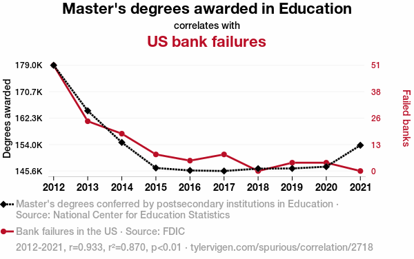 User prompt: Please make up a funny explanation for how a decrease in Master's degrees awarded in Education caused US bank failures to decrease.